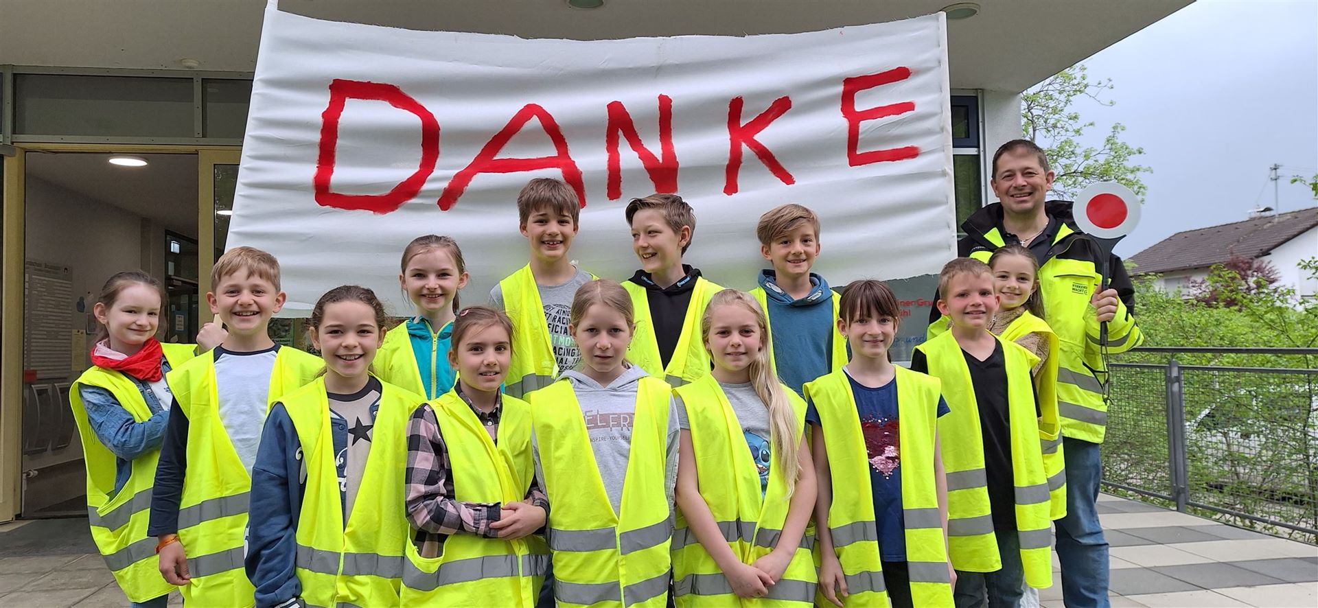 Mit einem Banner, auf dem mit roten Buchstaben „DANKE“ zu lesen war, bedankte sich die Holnstainer Schulfamilie bei allen „Bussi & Pfiadi -Platz – Nutzern“.