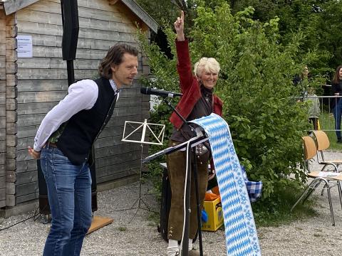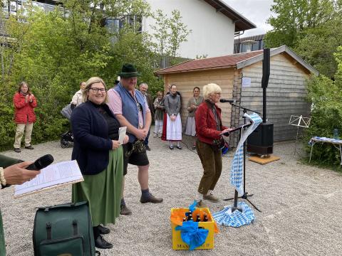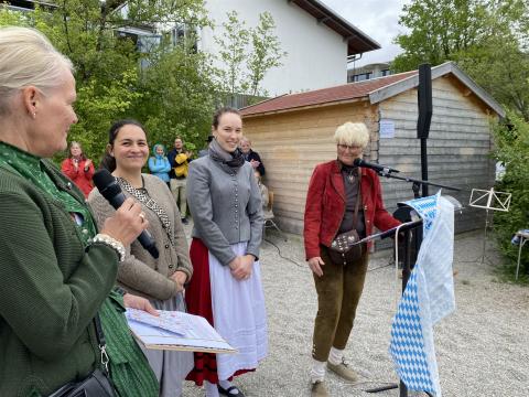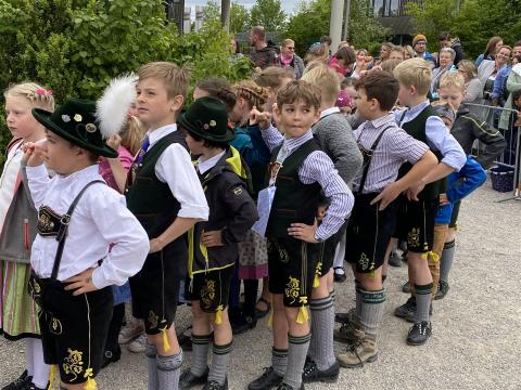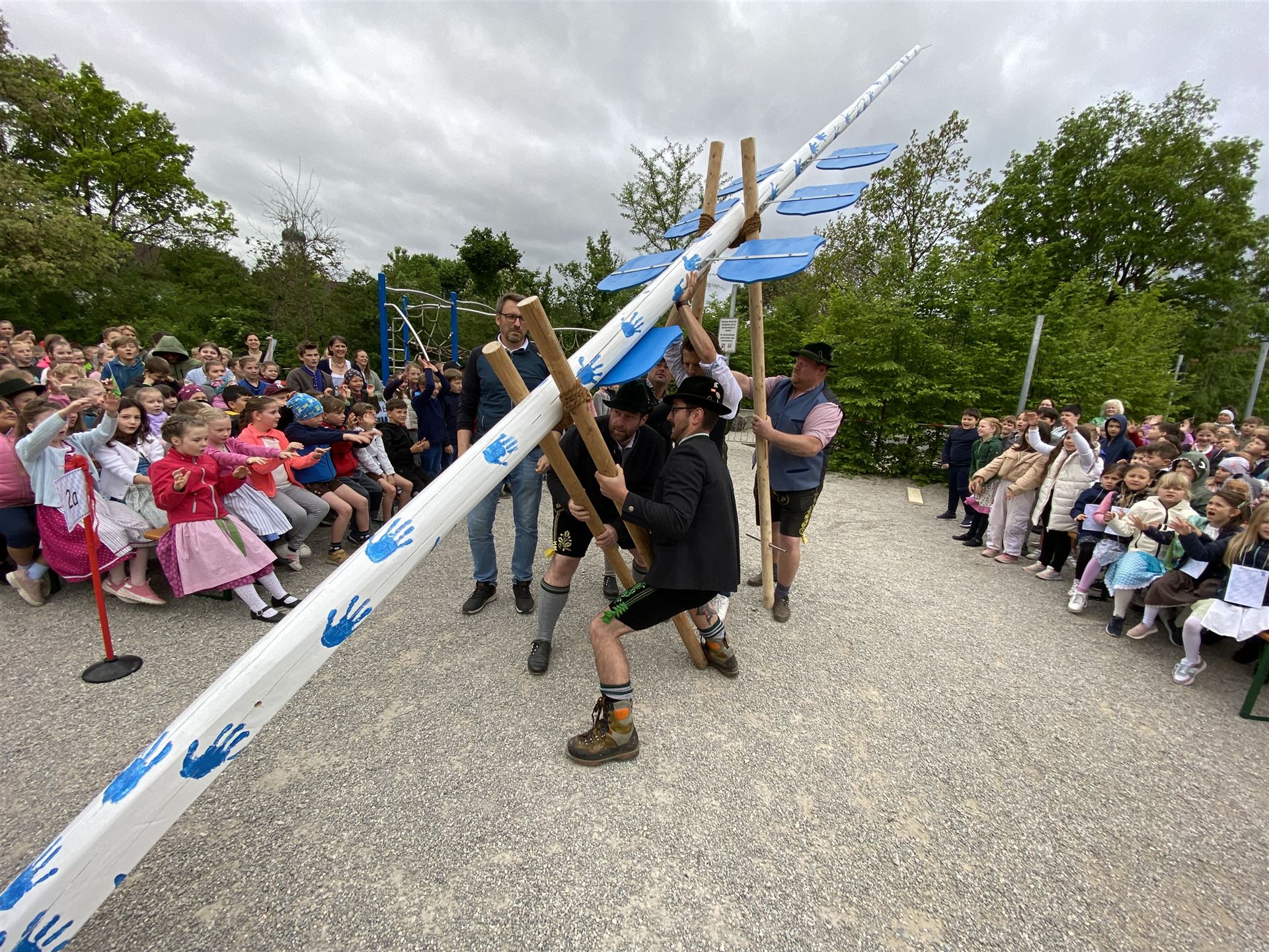 Zu den Klängen des bayerischen Defiliermarsches zogen die 14 Klassen ein und platzierten sich unter „ihrem“ Maibaum. Unter Leitung von Sophie Neumaier und Johanna Liewald vom Bruckmühler Trachtenverein war es für alle Göttinger und Bruckmühler Trachtler-Kinder eine Ehre – ohne Probe – das Fest mit einem klassischen Auftanz zu eröffnen. „Und … wie is er?“, fragte Schulleiterin Birgit Splett in das große Rund und deutete auf das weiß-blaue Kunstwerk. „Mei ´o Mai is der schee!“, kam es im fröhlichen Chor als Antwort. Von frischen Temperaturen und sehr böigem Wind unbeeindruckt, präsentierten die Holnstainer Schulkinder stolz ihr Programm. Die bayrischen Tänze „Kuckuckspolka“ (2Gö, Lehrerin Ursula Brunnhuber), „Kikeriki“ (1a, Lehrerin Claudia Olsson), „Bauernmadl“ (1b, Konrektorin Gabriele Stockburger) und „Siebenschritt“ (1c, Denise Heußinger) wurden – gemäß der Tradition – rund um den weißen, mit blauen Handabdrücken ganz speziell gestalteten „Holnstainer“ Maibaum getanzt. „Das sieht man heutzutage ja kaum noch,“ sagte eine ältere Dame und eine Träne der Rührung rollte über ihre Wange. Und als dann das alte Volkslied „Alles neu macht der Mai“ - gesungen von allen Mädls und Buam – über den Pausenhof schallte, war allen klar: „Das ist ein echtes Mai-Schulfest!“ Viel Applaus gab es für die Maibaum-Spender-Familie Fraunholz, für die Fachoberlehrerin Gabriele Ritter, die mit ihrer Fachkompetenz die „Malerarbeiten“ der Schulkinder am Maibaum koordinierte und v.a. auch für die 4. Klasse aus dem Schulhaus Götting, die die „Daferln“ mit den schulischen Motiven bemalt hatten. In dem von der Lehrkraft Monika Brandl umgedichteten Lied „Drunt in der Pause schau, steht a Maibaum weiß blau“, wurden diese Motive allen Anwesenden musikalisch eindringlich nahegebracht.