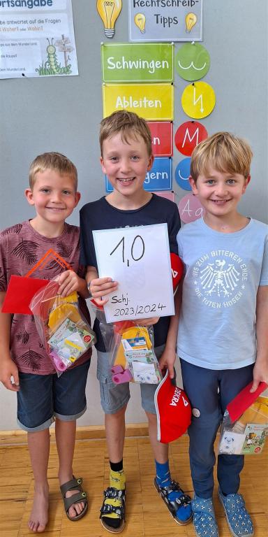 Höchste Hochachtung für 3 Buben und 5 Mädchen aus den 3 vierten Klassen der Holnstainer Grundschule! „Wenn ein Schulkind in jedem der 3 Übertrittsfächer Mathematik, Heimat- und Sachkunde und Deutsch im Übertrittszeugnis die Note 1 erreicht hat, dann ist das schon eine Ehrung wert!“, so die Klassenlehrkraft der 4a. Auch, dass die ganze Klasse sich mit den „Geehrten“ freute, was am herzlichen Applaus zu spüren war, zauberte den Pädagoginnen ein Lächeln ins Gesicht. „Dies zeigt, dass die Klassen während der vergangenen vier Grundschuljahre zu einer echten Gemeinschaft zusammengewachsen sind“, fasste die Schulleitung Birgit Splett zusammen. Sichtlich stolz nahmen die Einserschülerinnen und -schüler als Anerkennung ihrer wirklich beeindruckenden Leistung Gutscheine der Buchhandlung Librano und von Manu's Cartoleria E Libri sowie eine Überraschungstüte aus den Händen ihrer Schulleiterin entgegen. „Ich bin sehr stolz auf mich! Aber ich weiß, dass es ab der 5. Klasse bestimmt nicht mehr lauter Einser werden!“, so Matteo aus der 4a.