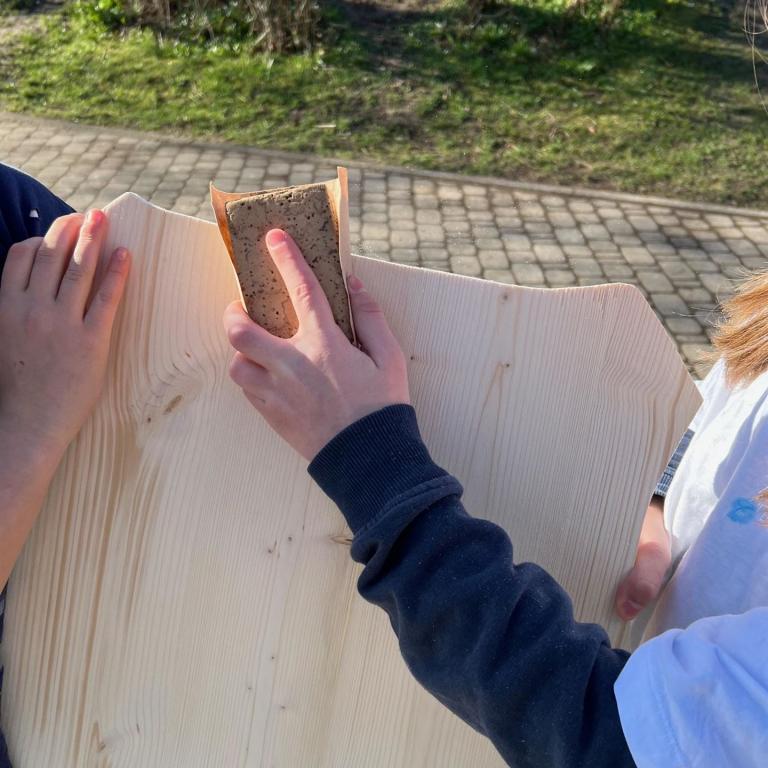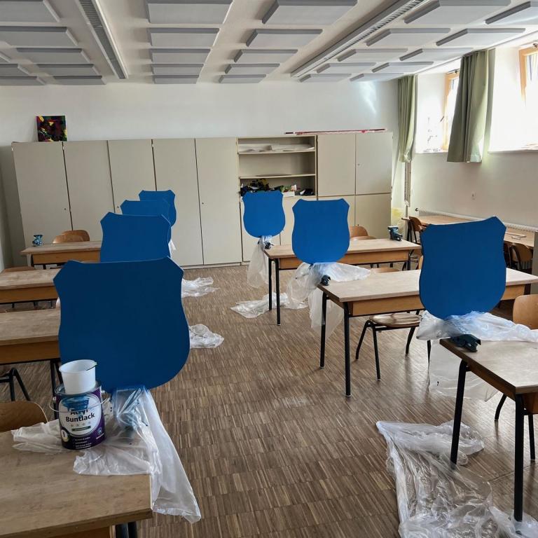 Während im Bruckmühler Schulhaus fleißig der Stamm unseres neuen Maibaums von den Schülern abgeschliffen und bemalt wird, kümmert sich die 4. Klasse in Götting um die Gestaltung der neuen Maibaumschilder. Bereits vor den Osterferien wurden die Holzschilder gründlich abgeschliffen und mit blauer Farbe grundiert.