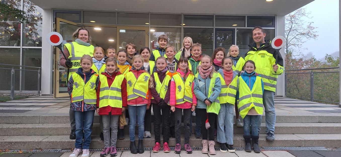 Holnstainer Viertklässler, Eltern-Lotsen, Elternbeirat, Schulleitung sowie die Polizei waren wieder eine Woche lang aktiv, um allen Nutzern die richtige Verkehrsführung auf dem Bussi & Pfiadi – Platz und vor der Grundschule in der Rathausstraße in Erinnerung zu rufen. Und das ist gelungen! „Danke, dass Sie die „Bussi & Pfiadi Zone“ benutzen!“ Das hörten so manche Eltern in dieser Aktions-Woche mehrfach. Der Andrang in der 2. Oktoberwoche auf der „Bussi & Pfiadi-Fläche“ war trotz des schönen Spätsommer-Wetters hoch. Die Schülerinnen und Schüler der 4a und der 4b aus dem Schulhaus Bruckmühl freuten sich über jede Mama und jeden Papa oder über Großeltern, wenn diese ihr Schulkind mit einem liebevollen Bussi und einem fröhlichen Pfiadi in den Schultag verabschiedeten. Als kleines Danke wurden von 7.20 Uhr bis 8.00 Uhr gelbe „Danke“-Zettelchen verteilt. „Die Woche war ein voller Erfolg. Die meisten Eltern waren sehr vorbildlich und zeigten volle Unterstützung. Schließlich geht es um die Sicherheit unser aller Kinder. Die Verkehrsteilnehmer, die sich nicht an die Regeln gehalten haben, wurden von uns aufgeklärt und sahen alle ein, dass die besondere Rücksichtnahme für die Kleinen sehr wichtig ist. So ist zu hoffen, dass mit diesem Bewusstsein die Sicherheit wieder ein Stück verbessert werden konnte!“, so fasste Herr Alexander Mooser, stellvertretender Elternbeiratsvorsitzender und Koordinator der Elternlotsen, das Ziel und das Ergebnis dieser Aktionswoche zusammen.
