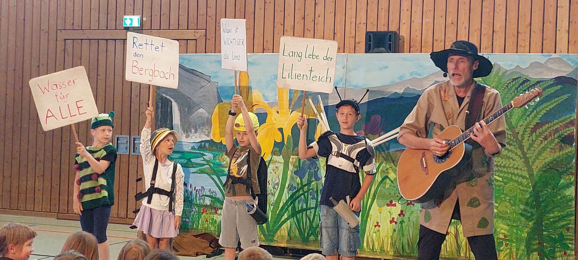 So waren es die Mädchen und Buben selbst, die beim Aufbau mithalfen, die Einleitung vorlasen, mit verschiedenen Rhythmusinstrumenten die Geschichte begleiteten und sogar als Schauspieler in die Rollen des Wasserläufers, des Gelbrandkäfers, der Raupe, des Tausendfüßlers sowie der Ameise schlüpften.