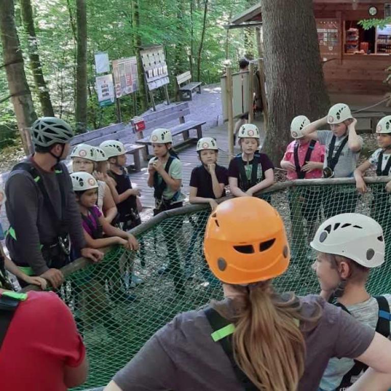 Am 29. Juni 2023 war es endlich soweit. Die Pausenengel der Holnstainer Grundschule Bruckmühl (wir berichteten) wurden für ihr freiwilliges Engagement mit einem Ausflug in den Klettergarten Prien belohnt. Mit dem Zug ging es zusammen mit ihren Ausbilderinnen Veronika Mayer, Diplom-Sozialpädagogin, Monika Brandl, Lehrkraft und Pia Strnad (Freiwilliges soziales Jahr) Richtung Chiemsee. Dort durften die Viertklässler für 3 Stunden unter professioneller Anleitung mit Blick auf den Chiemsee durch den Wald klettern. So konnten die Pausenengel, die zurecht mit Stolz auf ihre Leistungen im zu Ende gehenden Schuljahr zurückblicken, als eingeschworene Gruppe ihre ehrenamtliche Arbeit im Schulhaus Bruckmühl würdig abschließen. Ein besonders großer Dank geht an die Bürgermeister Heinritzi-Jugendstiftung, die den 23 Pausenengeln diesen tollen und teamstärkenden Tag ermöglicht haben.