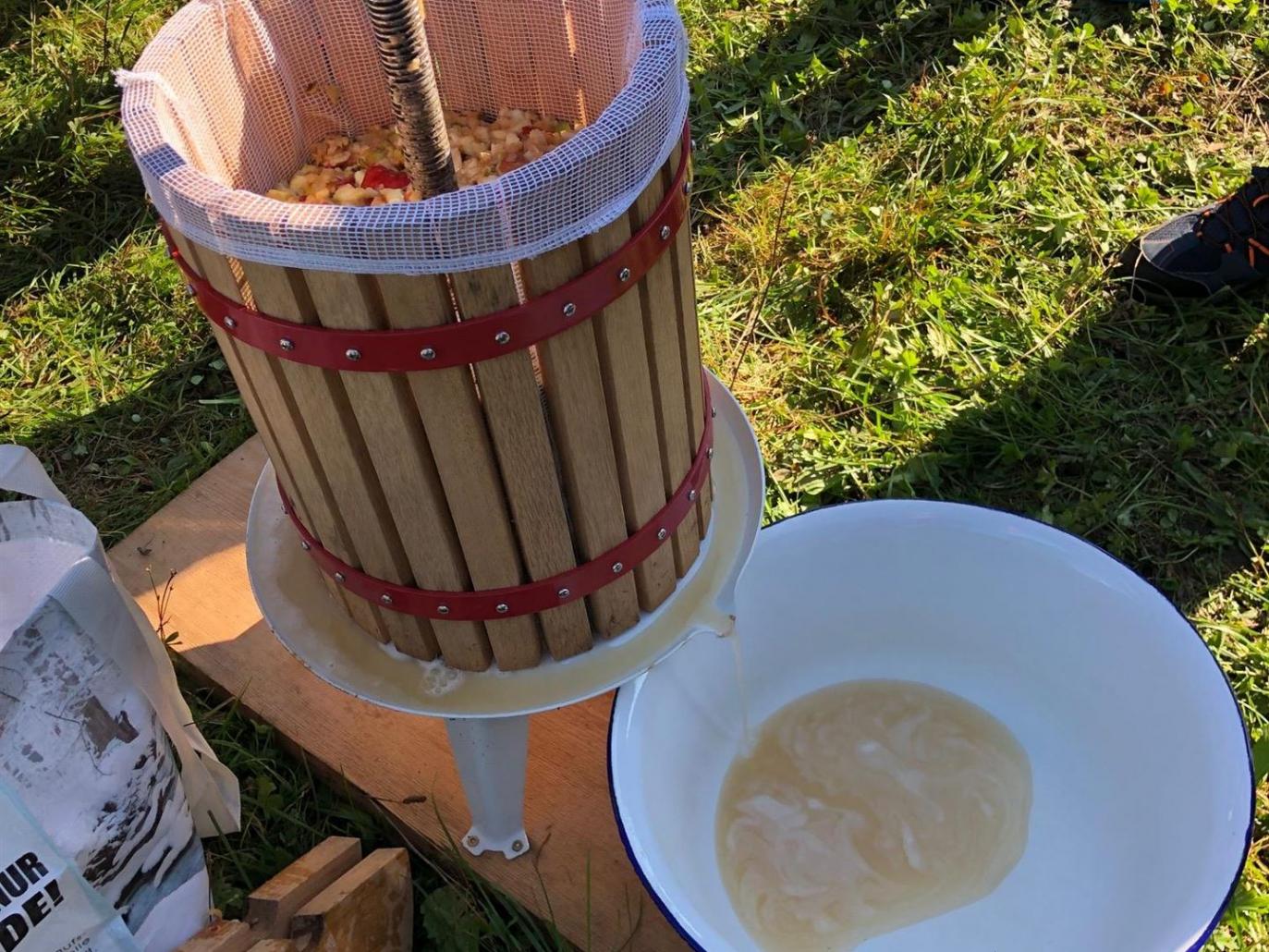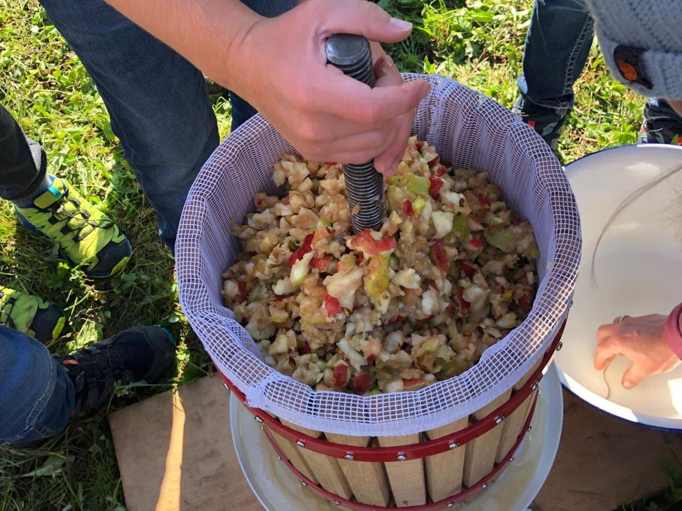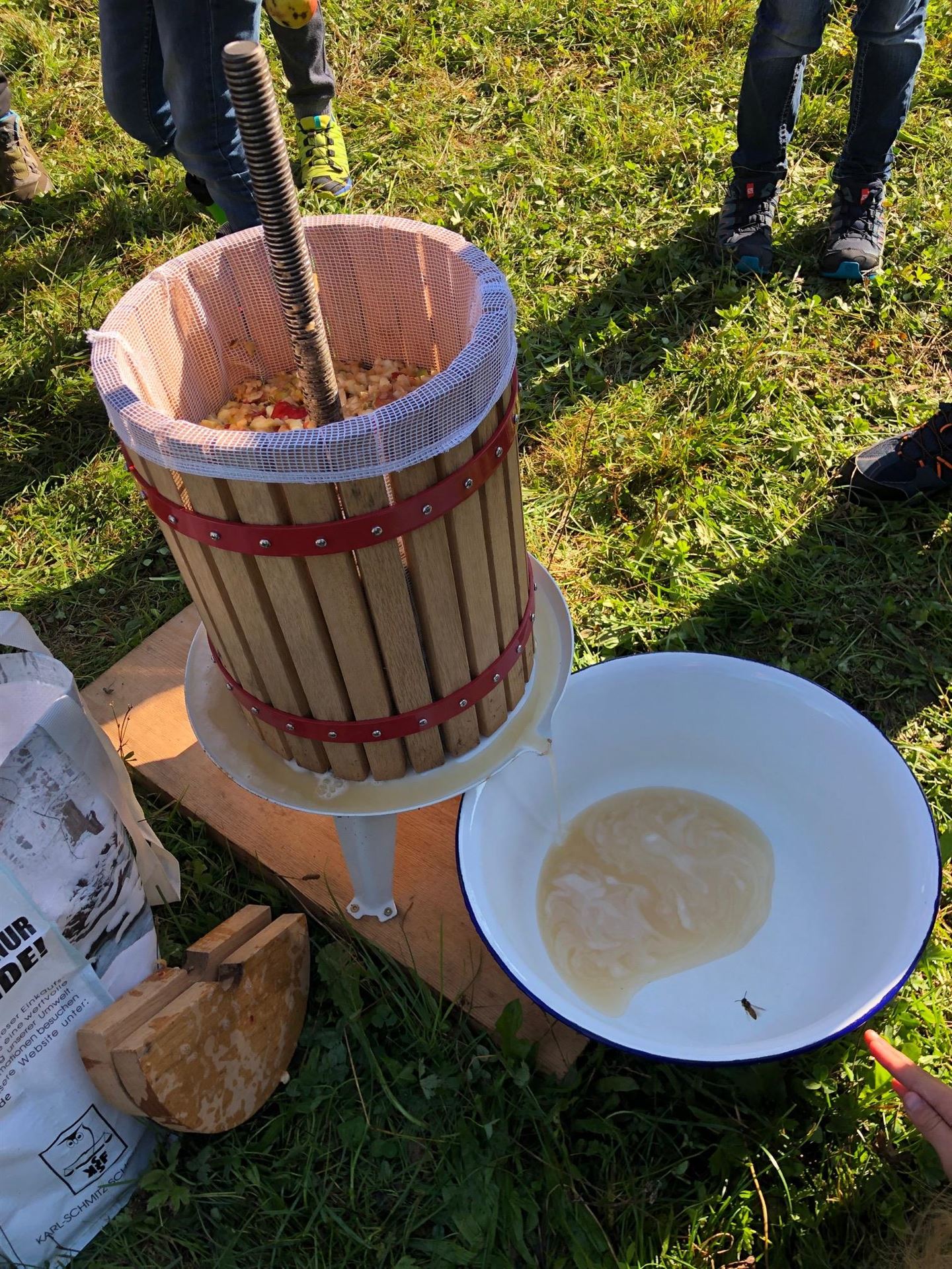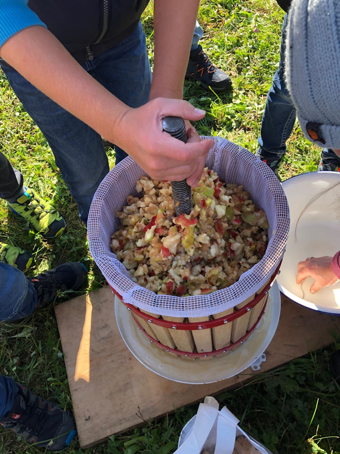 Nachdem der Baum kräftig geschüttelt wurde, haben wir die Äpfel vom Boden gesammelt und die faulen Früchte dabei ausgelesen. Danach wurden die Äpfel gewaschen und im Muser gemahlen. Der entstandene Trester kam in die Apfelpresse und mit viel Muskelkraft haben wir dann den Most herausgepresst.