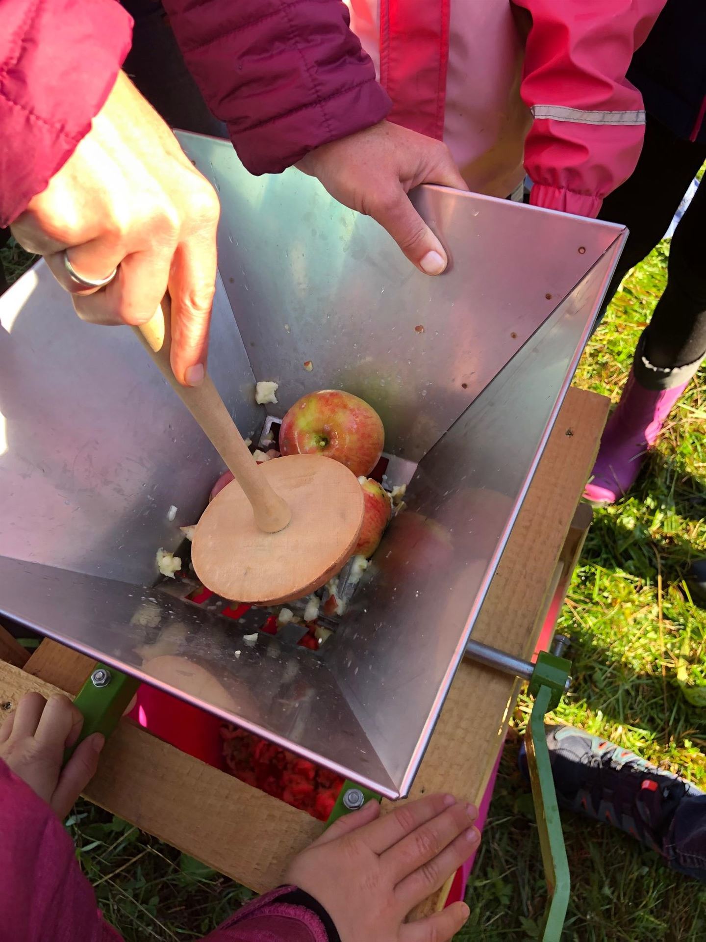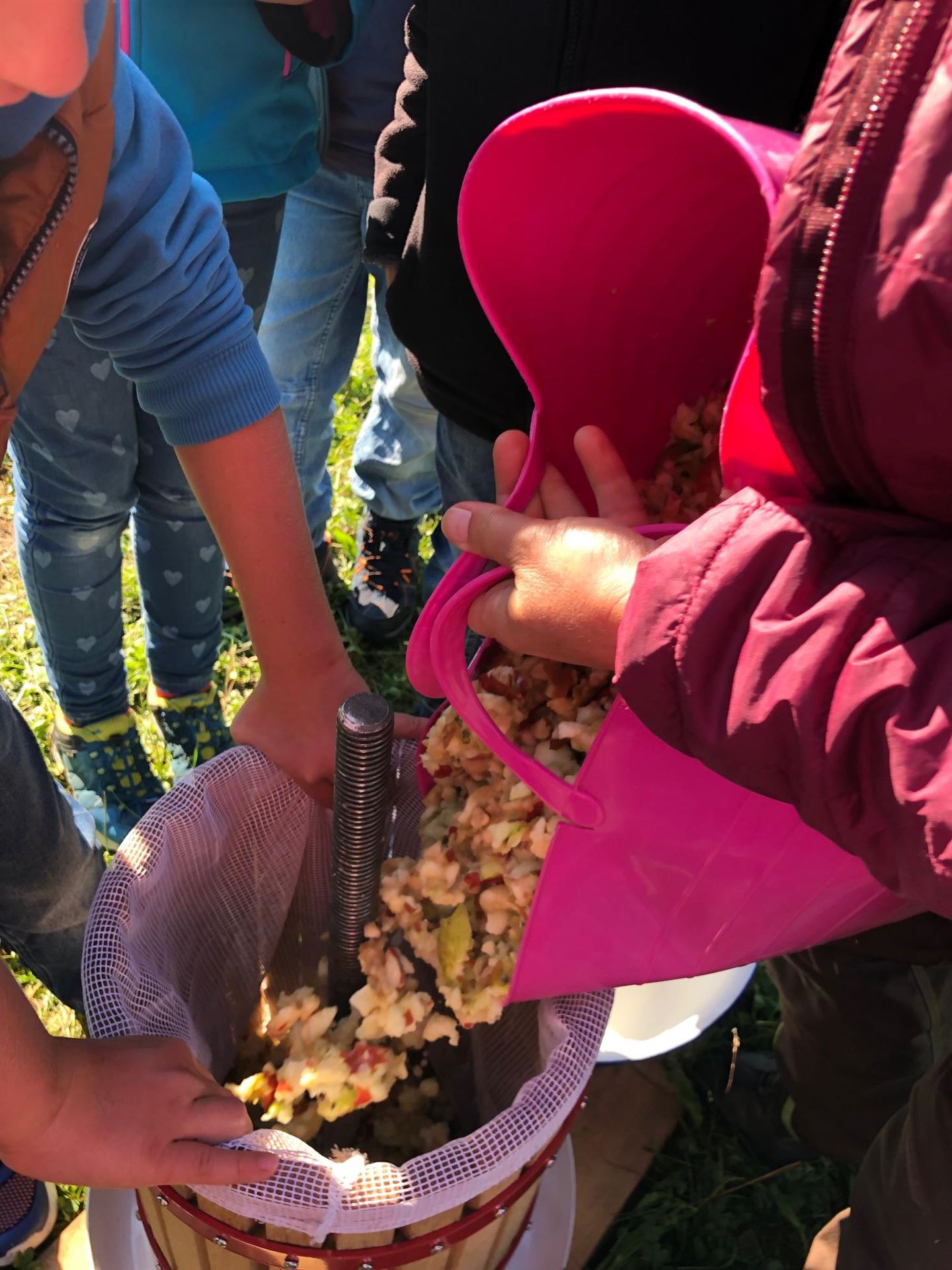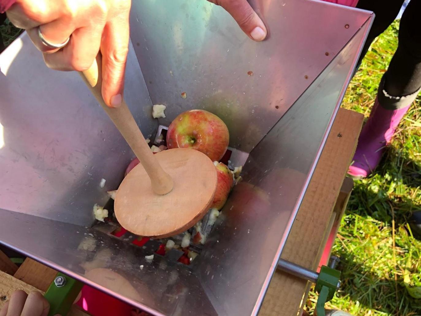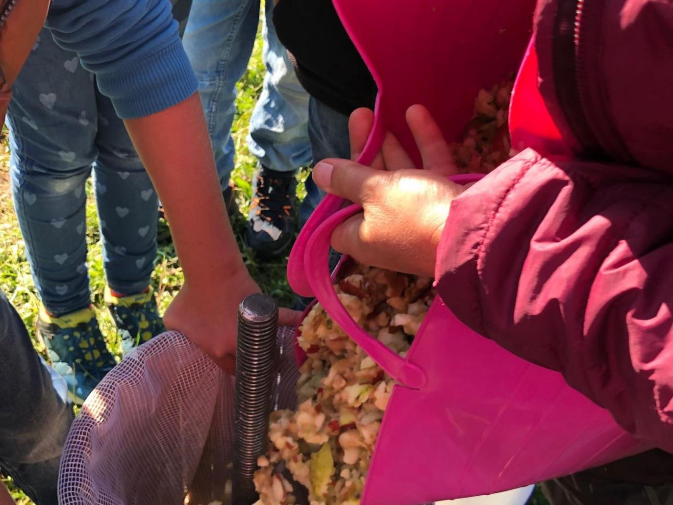 Nachdem der Baum kräftig geschüttelt wurde, haben wir die Äpfel vom Boden gesammelt und die faulen Früchte dabei ausgelesen. Danach wurden die Äpfel gewaschen und im Muser gemahlen. Der entstandene Trester kam in die Apfelpresse und mit viel Muskelkraft haben wir dann den Most herausgepresst.